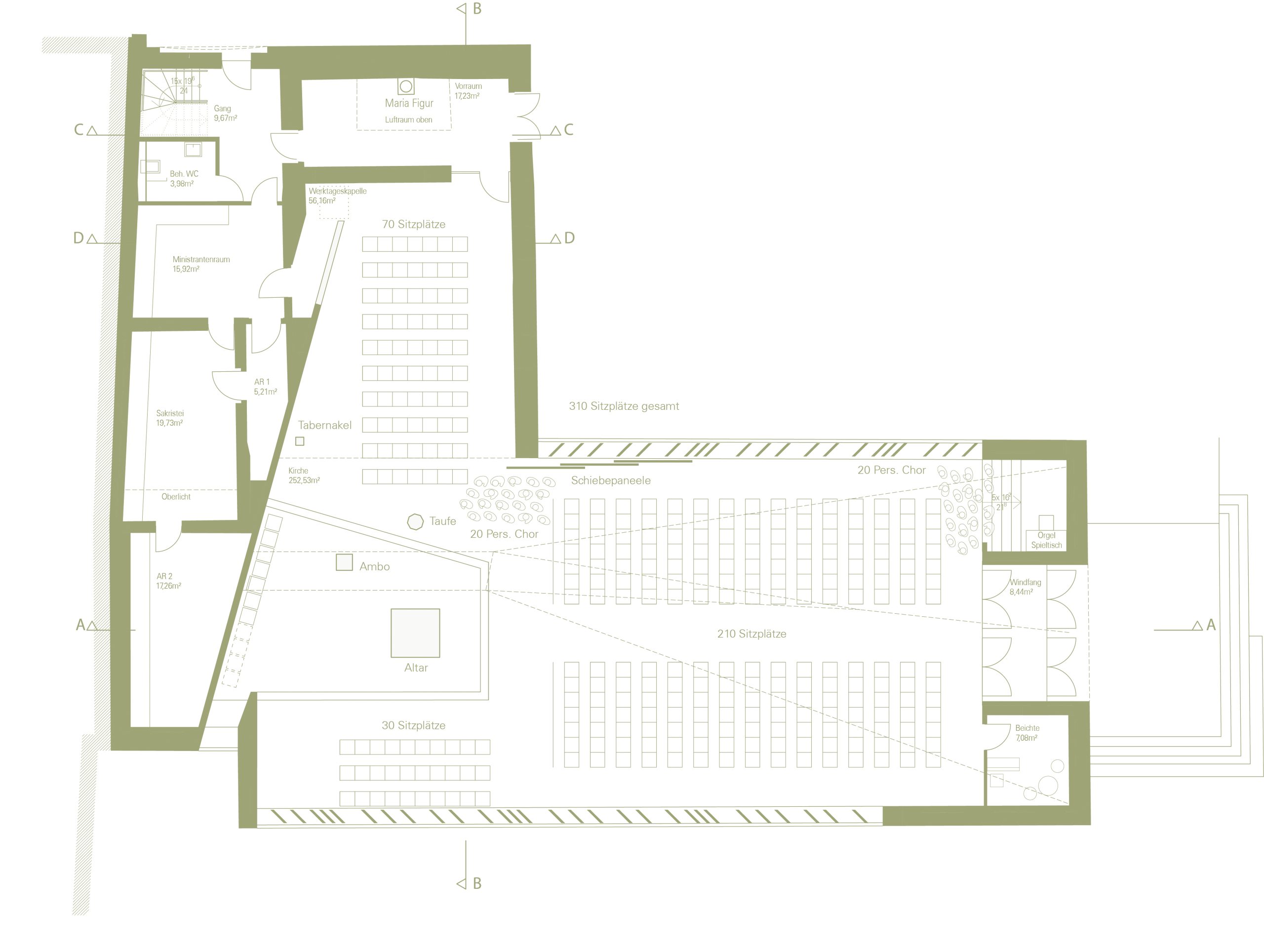 Die Orientierung im Inneren wird beibehalten. Der Altarbereich erhält seine Zentrierung durch ein bandartiges Oberlicht, das mit dem indirekten Licht der Wandscheiben hinter dem Altar korrespondiert. Diese schräge Wandscheibe verbindet Hauptraum und Kapelle und definiert spezifische Lichtsituationen. Über großzügige Schiebetüren können Kirchenraum und Kapelle zu einer Raumeinheit verbunden werden. Der Priester kann durch das Volk in den Kirchenraum einziehen. Der quadratische Altar wird in Raummitte positioniert, und orientiert sich wie der Ambo zum Hauptschiff wir zur Kapelle. Die Taufe wird am Übergang zur Kapelle verortet und ist so zentral eingebunden, liegt gleichsam auf dem Weg zur Wort- und Mahlfeier.